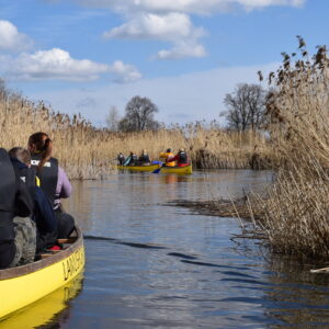 In the first part of the journey, there are several fallen trees – they can be overcome along the shore or by pulling the boat across the water (the way of overcoming changes depending on the water level in the river). On the second half of the trip, after a break, the river remains wider and there are no tree falls.